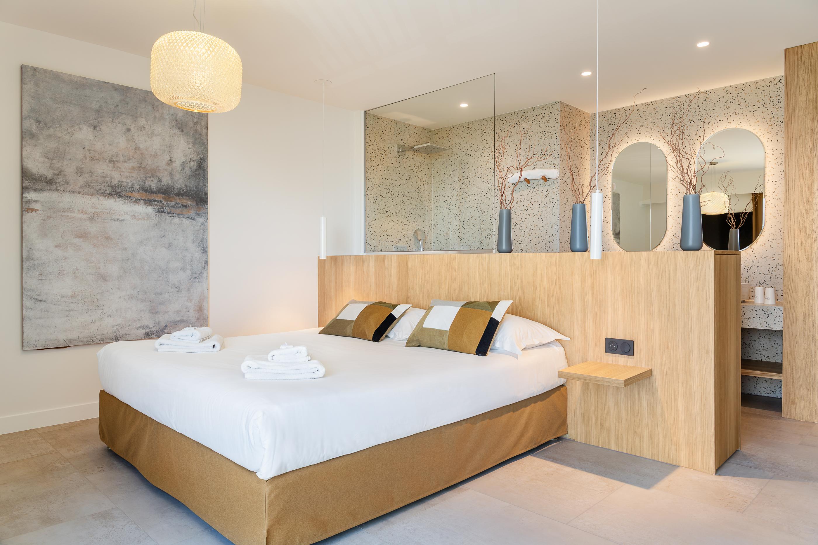 Sa large baie vitrée face au lit, tournée vers la nature méditerranéenne offre une immersion totale dans le paysage, dès le réveil. Une expérience immersive, des clins d’œil déco au charme des années 70, de beaux volumes, de la fluidité et une salle de bain design intégrée à l’espace nuit : faîtes de cette chambre élégante votre lieu de vie pour un court ou long séjour.